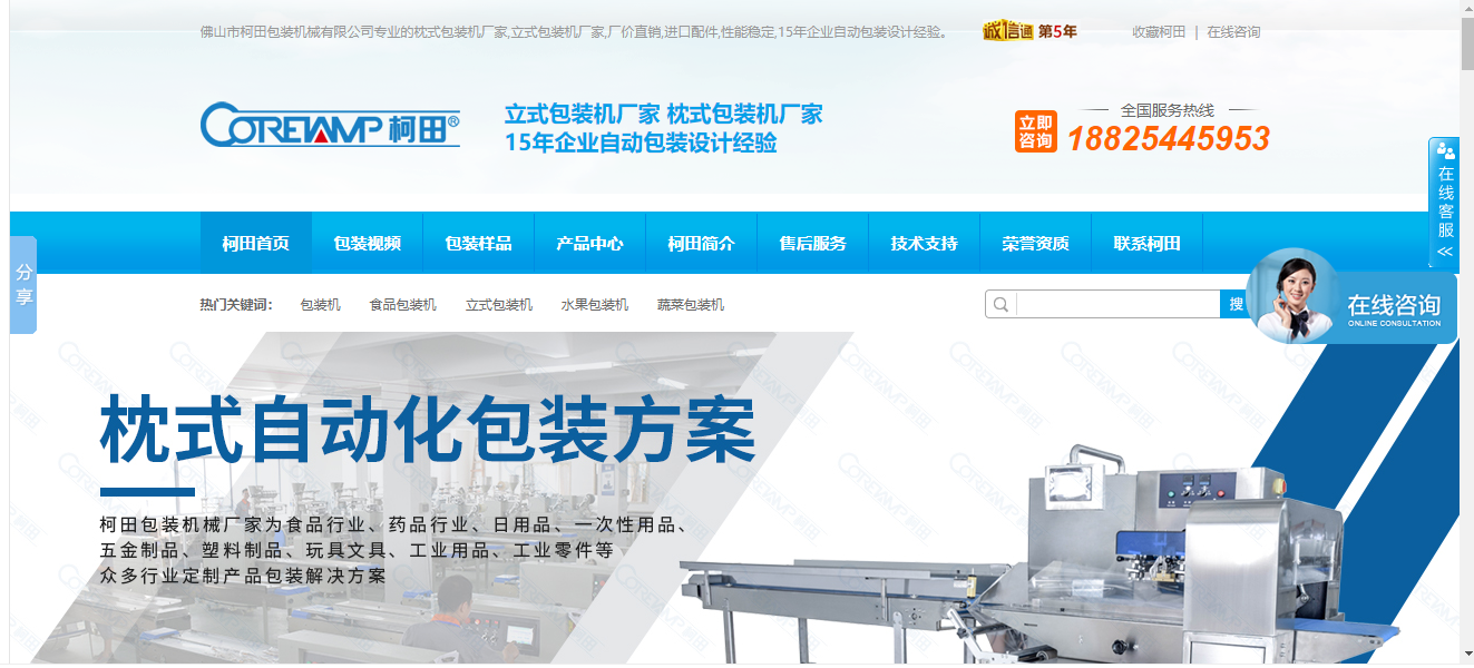 今天讓我們一起來分享一下包裝機網(wǎng)站推廣作品:佛山市柯田包裝機械有限公司總部位于廣東省佛山市新光源產(chǎn)業(yè)基地中心,成立于2012年,是一家集研發(fā)、設計、生產(chǎn)、銷售及售后服務于一體的高新制造企業(yè)。