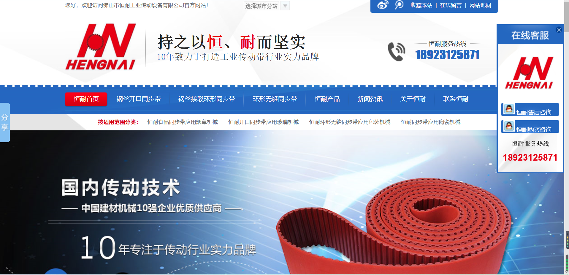 今天讓我們一起來分享一下同步帶網(wǎng)站推廣作品:佛山市恒耐工業(yè)傳動設備有限公司坐落在美麗的陽江市陽春春城,交通方便,離高速公路陽春南出口不到1公里。占地面積30000幾平方米,公司全線引進意大利、德國等先進生產(chǎn)設備和生產(chǎn)工藝。年產(chǎn)量超過100000條聚氨酯環(huán)形無駁口同步帶,品質(zhì)卓越,具有抗磨損,抗張拉,耐高溫,精度高等優(yōu)勢,成為“科達潔能”、“一鼎科技”等優(yōu)秀供應商,公司產(chǎn)品適用于陶瓷、玻璃、紡織、噴繪、鋁型材、自動化設備等機械所涉及到的同步帶。公司單品遠銷意大利、土耳其、埃及、印度、伊朗、巴西及東南亞地區(qū),廣泛得到國內(nèi)外客戶青睞。