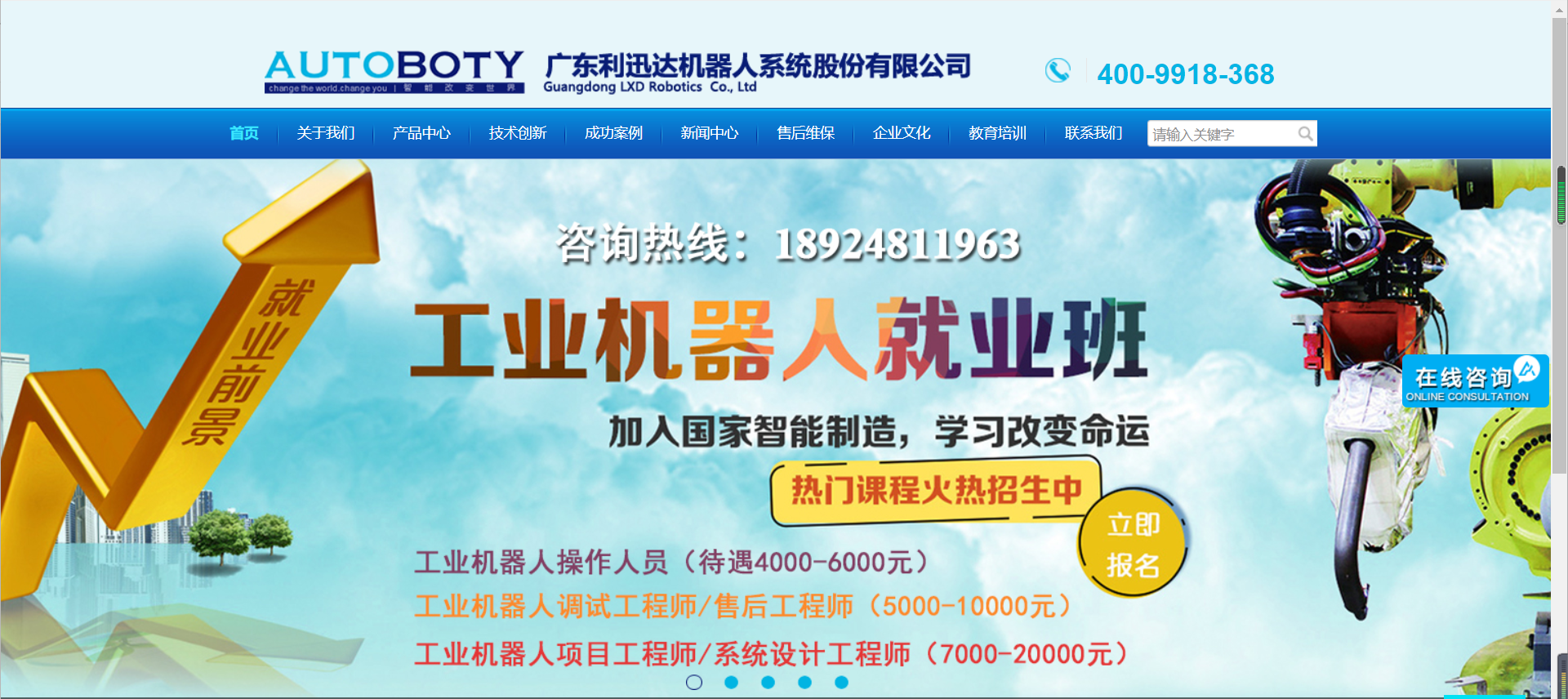 今天讓我們一起來分享一下工業(yè)機(jī)器人網(wǎng)站推廣作品: 廣東利迅達(dá)機(jī)器人系統(tǒng)股份有限公司,是中國現(xiàn)時技術(shù)先進(jìn)、實力強(qiáng)大的機(jī)器人系統(tǒng)集成商。自2008年籌建至今,公司共建立七大事業(yè)部和一個智能工匠加工中心,業(yè)務(wù)范圍涵蓋拋光打磨、焊接、搬運、裝配以及機(jī)器人教育、服務(wù)等。