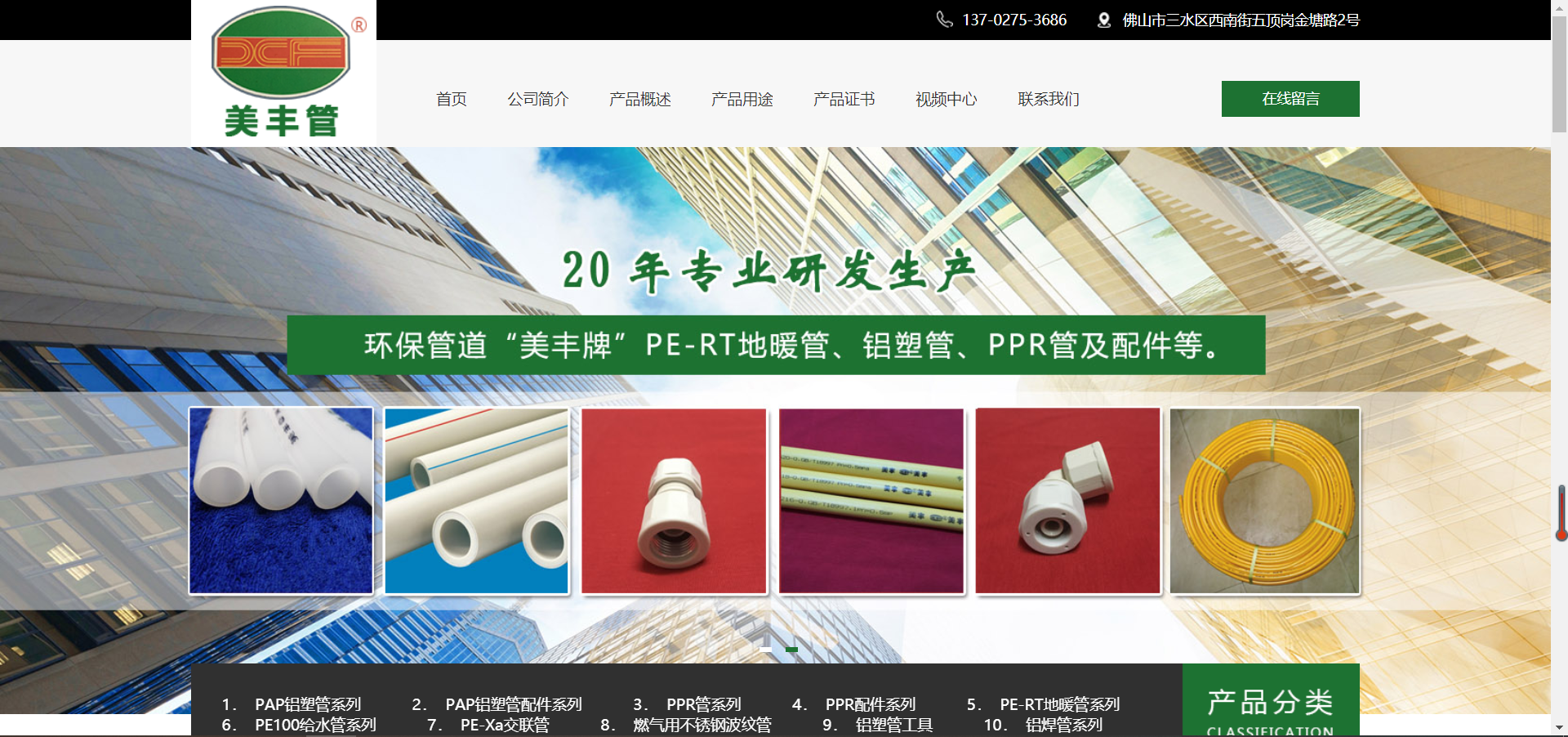 佛山市三水美豐鋁塑復(fù)合管有限公司創(chuàng)辦于1999年,工廠坐落于廣東佛山市三水區(qū)西南街五頂崗金塘路2號。用先進(jìn)的生產(chǎn)技術(shù)和設(shè)備,專業(yè)生產(chǎn)環(huán)保管道“美豐牌”鋁塑復(fù)合管(包括冷熱水用管、燃?xì)鈱S霉?、壓縮氣體輸送管)、專用地暖PE-RT管、工程用PP-R管、PE100燃?xì)庥霉芎徒o水管、特殊領(lǐng)域用鋁焊管及(鋁塑管、PERT管)專用塑料合金管件。生產(chǎn)過程嚴(yán)格執(zhí)行ISO9001質(zhì)量體系,確保產(chǎn)品達(dá)到國家檢測要求并符合歐美先進(jìn)國家同類產(chǎn)品質(zhì)量標(biāo)準(zhǔn)。
