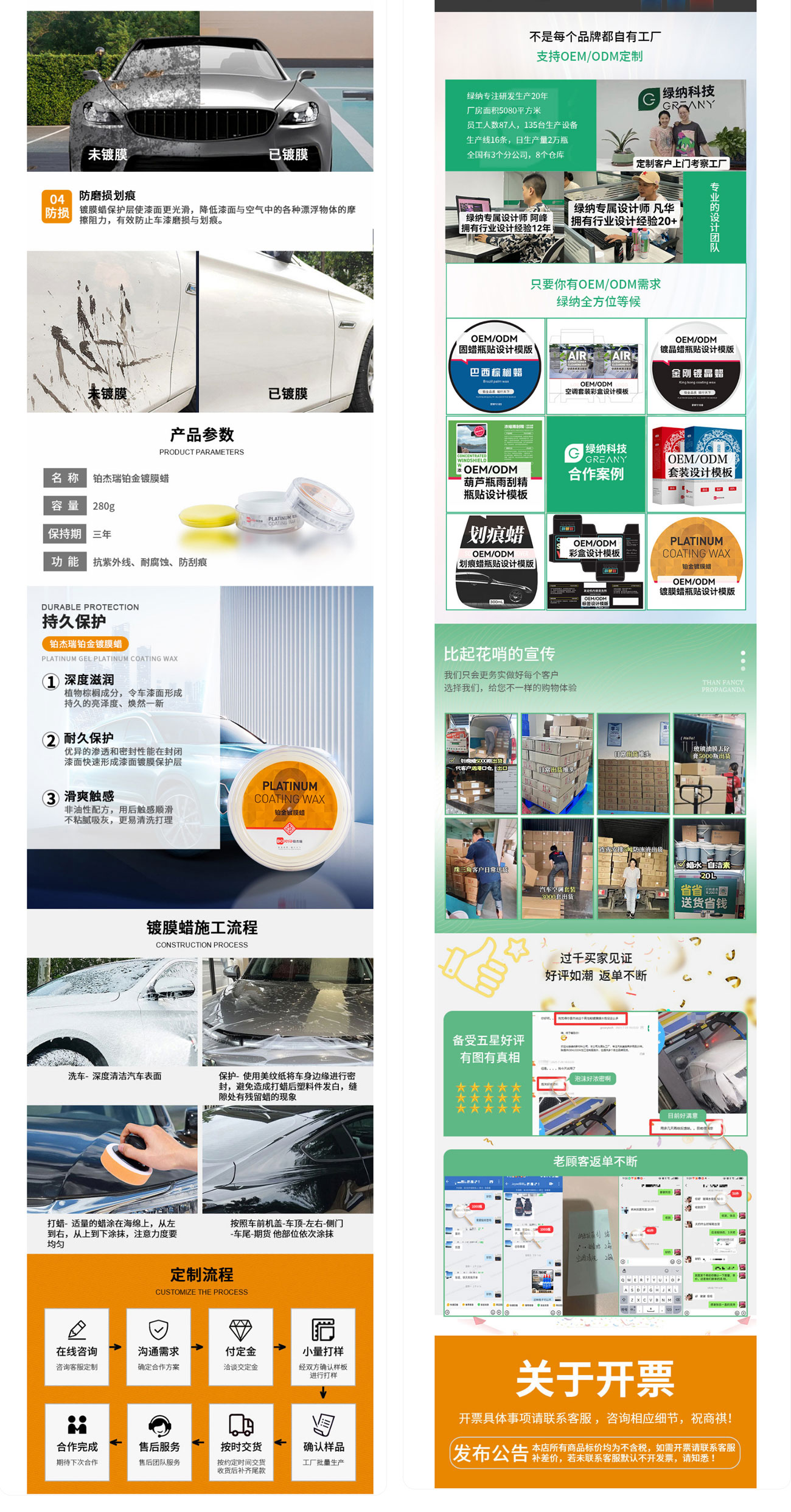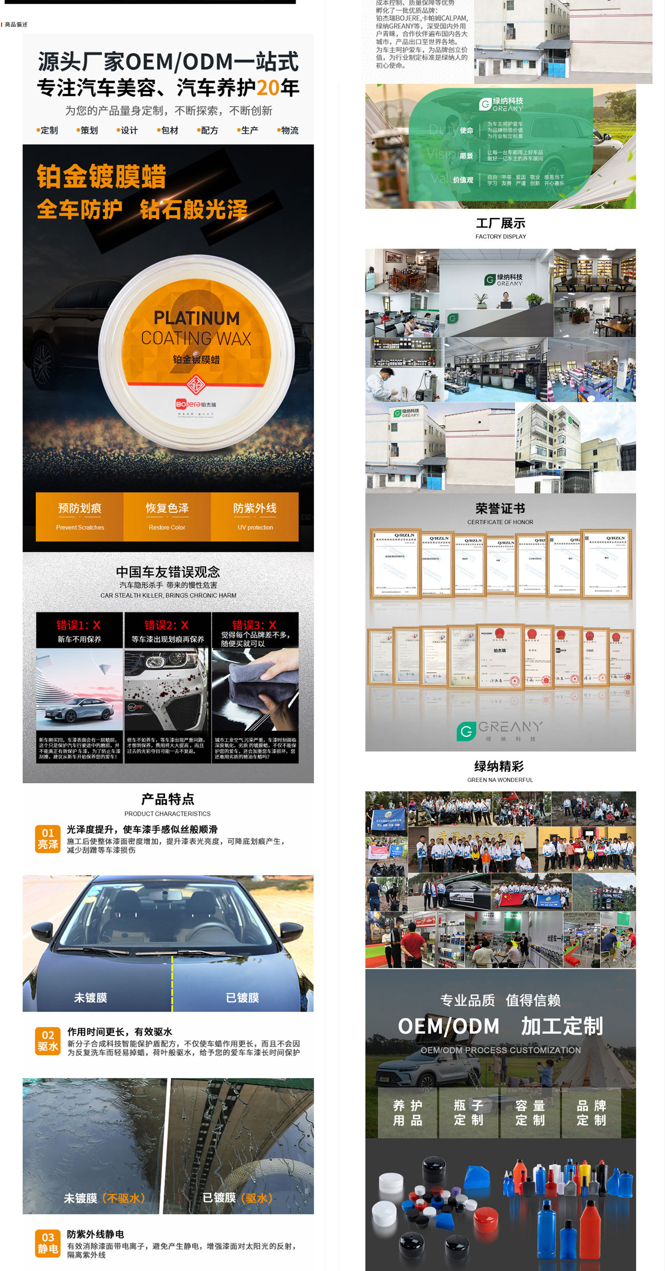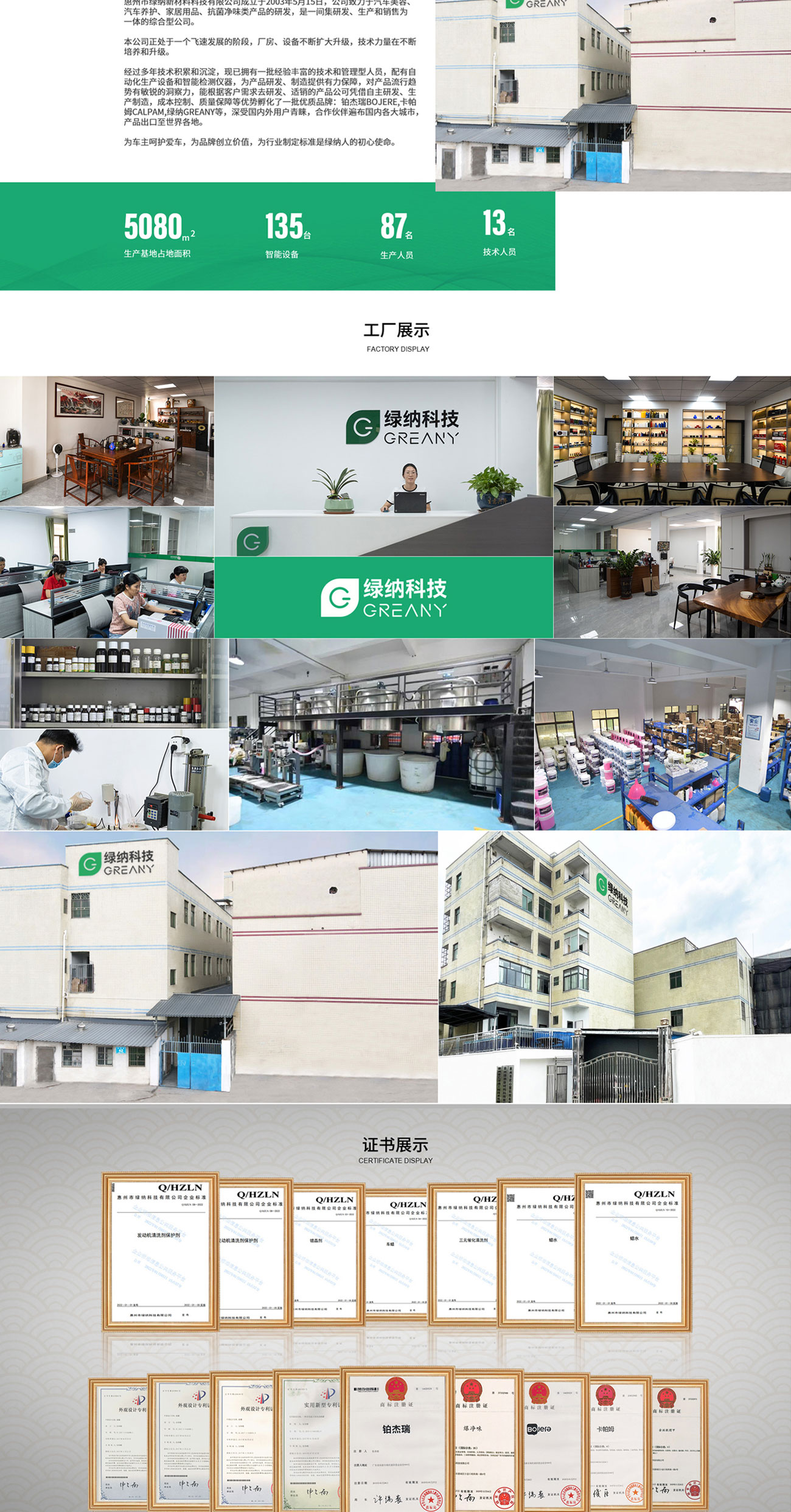 惠州市綠納新材料科技有限公司成立于2003年5月15日,公司致力于汽車美容、汽車養(yǎng)護(hù)、家居用品、抗菌凈味類產(chǎn)品的研發(fā),是一間集研發(fā)、生產(chǎn)和銷售為一體的綜合型公司。為車主呵護(hù)愛車,為品牌創(chuàng)立價值,為行業(yè)制定標(biāo)準(zhǔn)是綠納人的初心使命。