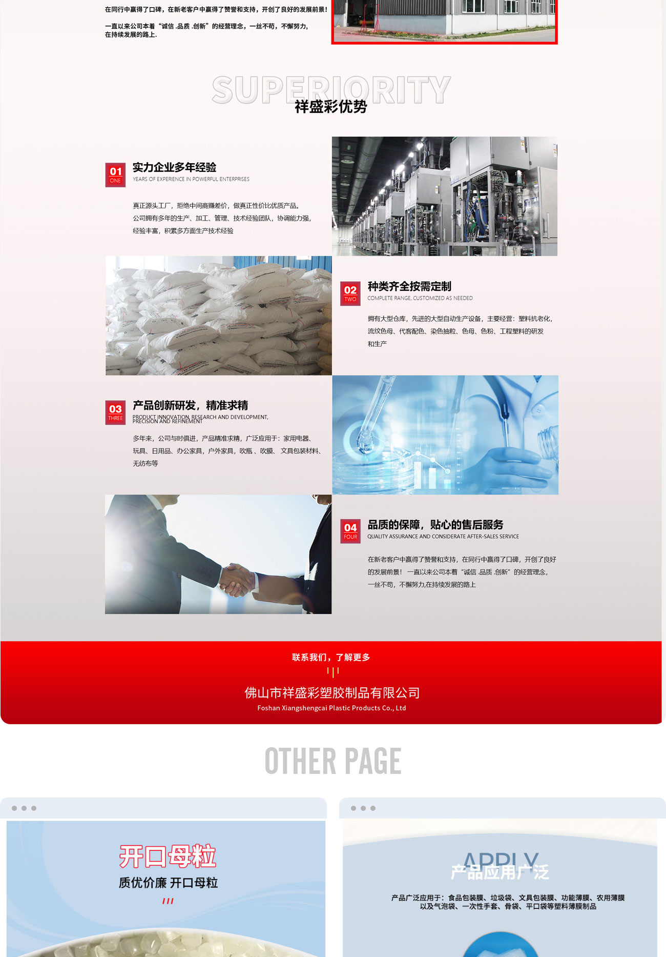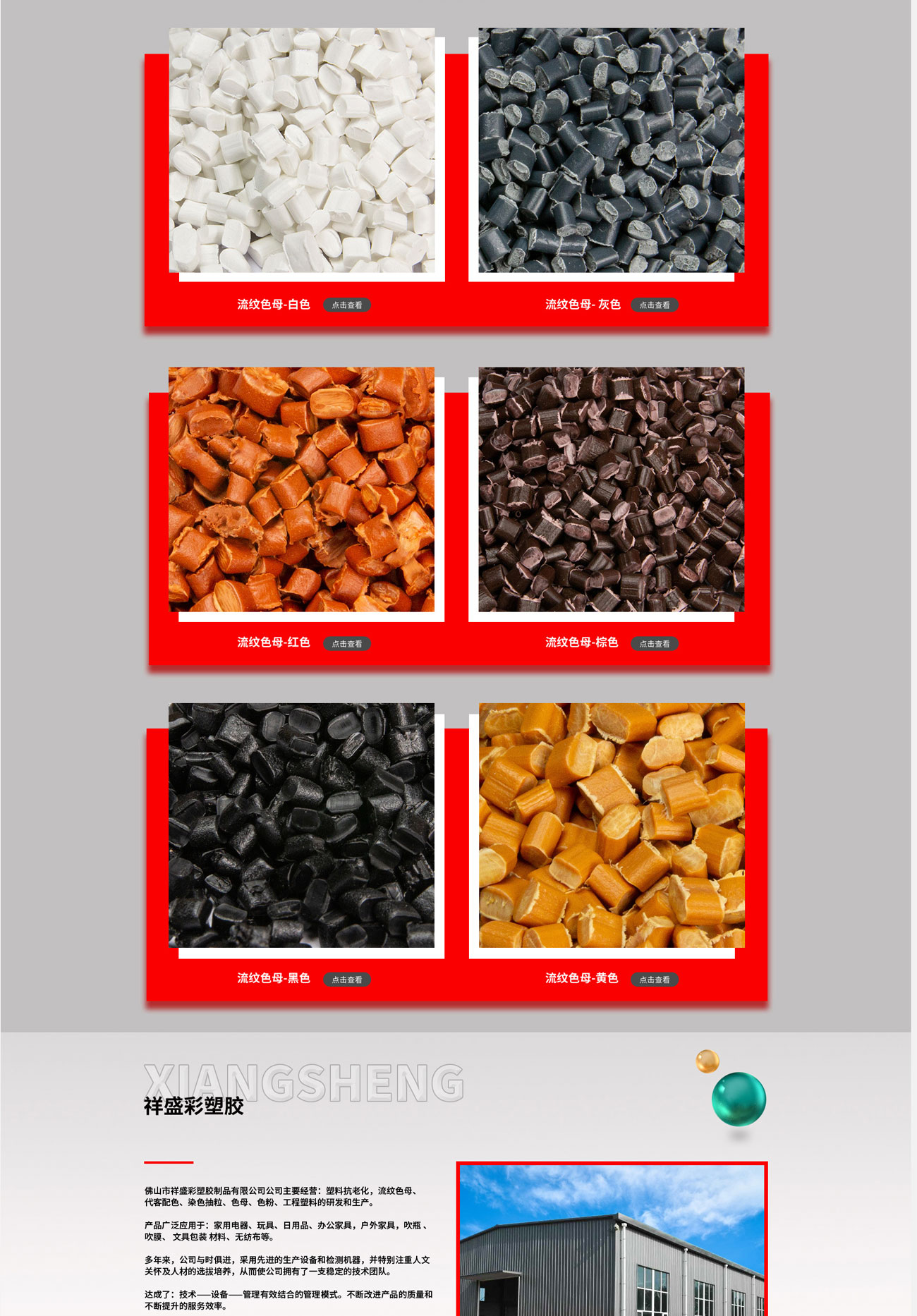 佛山市祥盛彩塑膠制品有限公司主要經(jīng)營:塑料抗老化,流紋色母代客配色、染色抽粒、色母、色粉、工程塑料的研發(fā)和生產(chǎn)。產(chǎn)品廣泛應(yīng)用于:家用電器、玩具、日用品、辦公家具,戶外家具,吹瓶、吹膜、文具包裝材料、無紡布等。