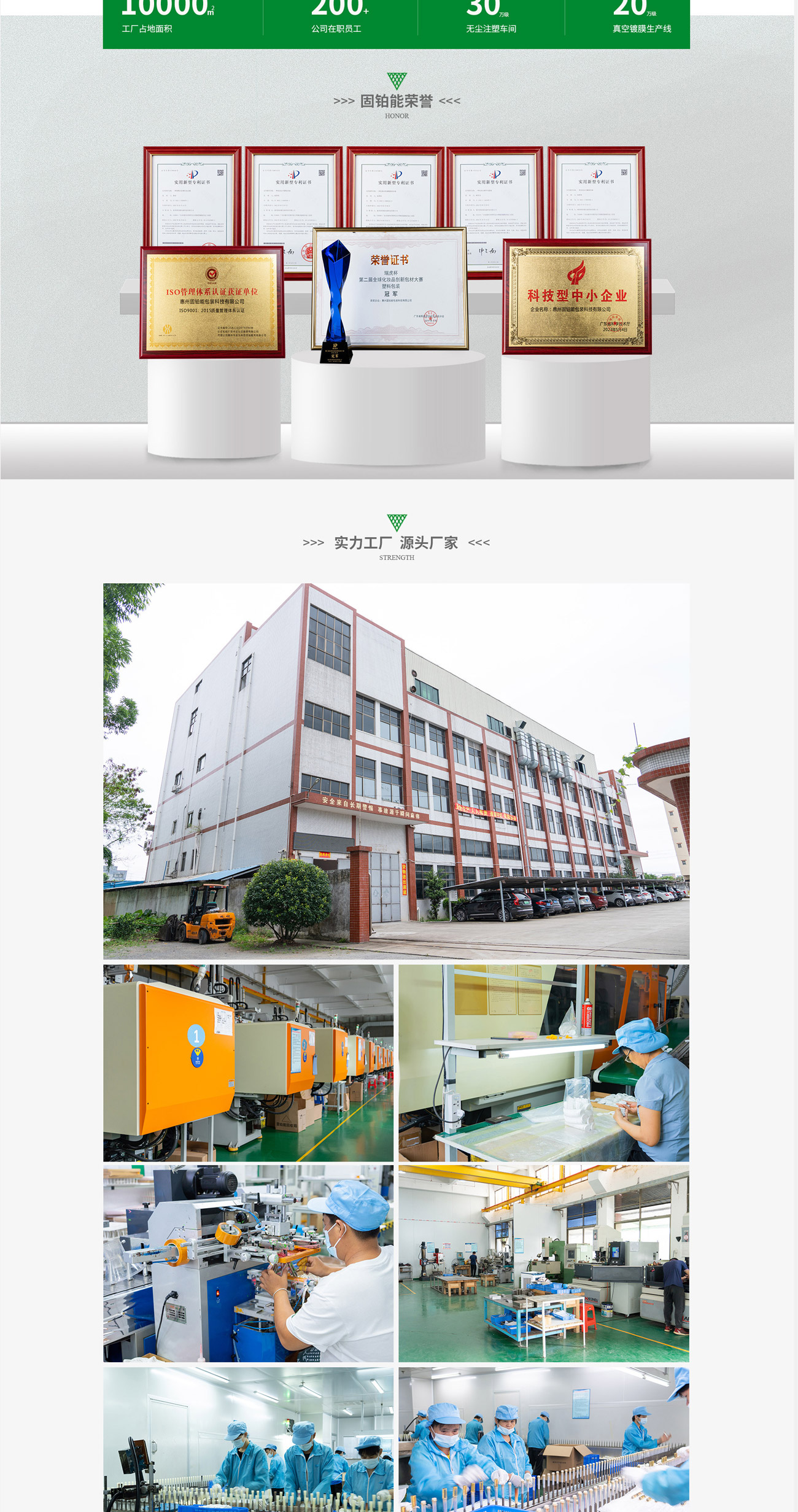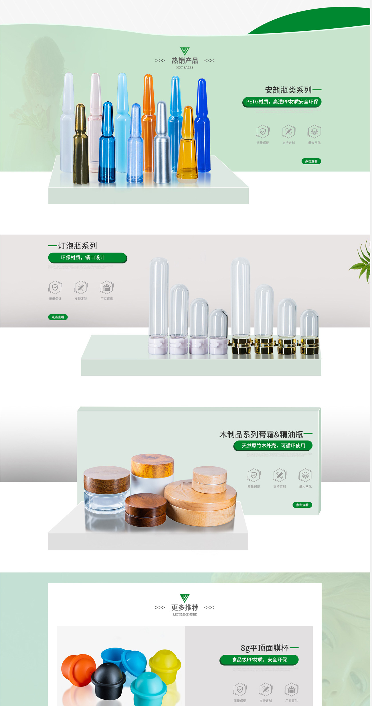 店鋪建設(shè)采用明亮、簡(jiǎn)約的風(fēng)格,色調(diào)以綠色、淺綠色為主,搭配白色和灰色,突出了清新、新穎的質(zhì)感。體現(xiàn)出固鉑能在高端化妝品包裝的研發(fā)和生產(chǎn),從而促進(jìn)用戶對(duì)固鉑能的品質(zhì)信賴。
