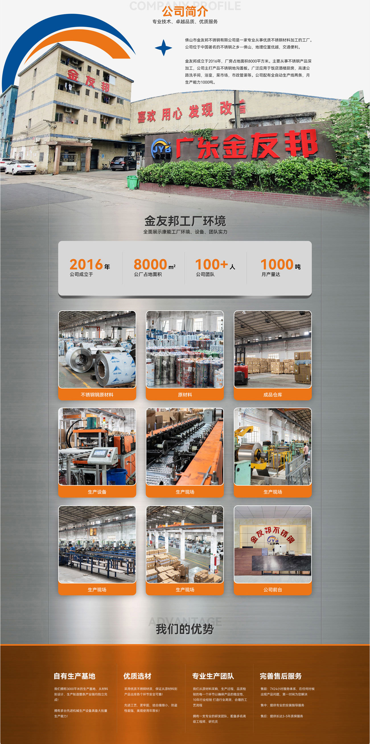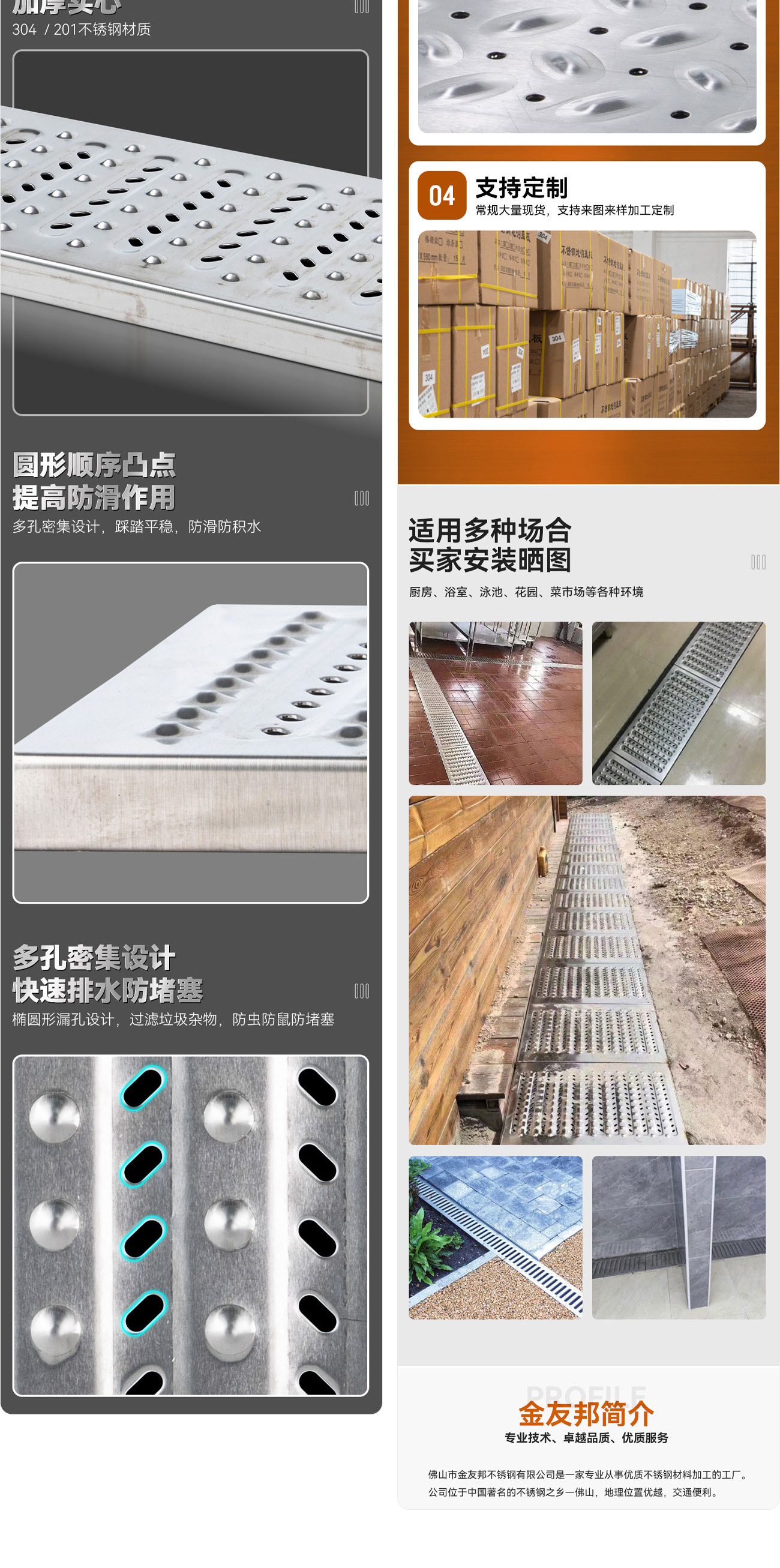 佛山市金友邦不銹鋼有限公司是一家專業(yè)從事優(yōu)質(zhì)不銹鋼材料加工的工廠。公司位于中國著名的不銹鋼之鄉(xiāng)—佛山,地理位置優(yōu)越,交通便利。公司主要從事不銹鋼產(chǎn)品深加工,公司主打產(chǎn)品不銹鋼地溝蓋板;廣泛應(yīng)用于飯店酒樓廚房,高速公路洗手間,浴室,菜市場,市政管渠等。